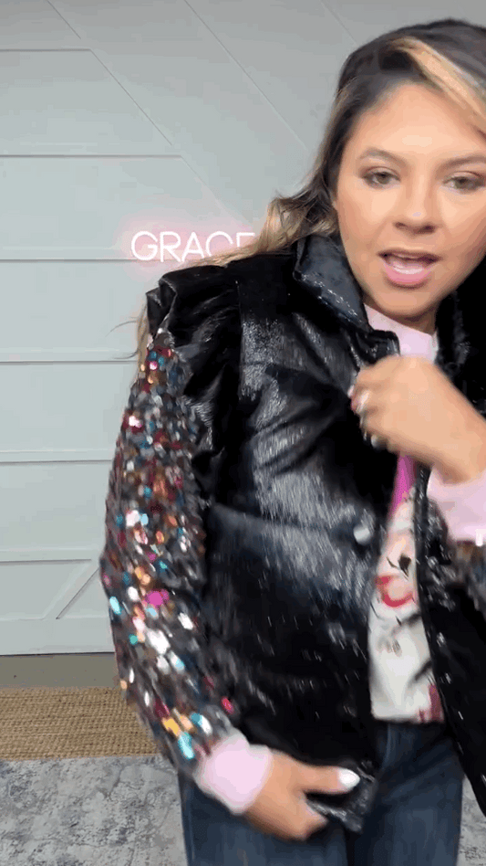 Black Shimmer Ruffle Sleeve Puffer Vest
