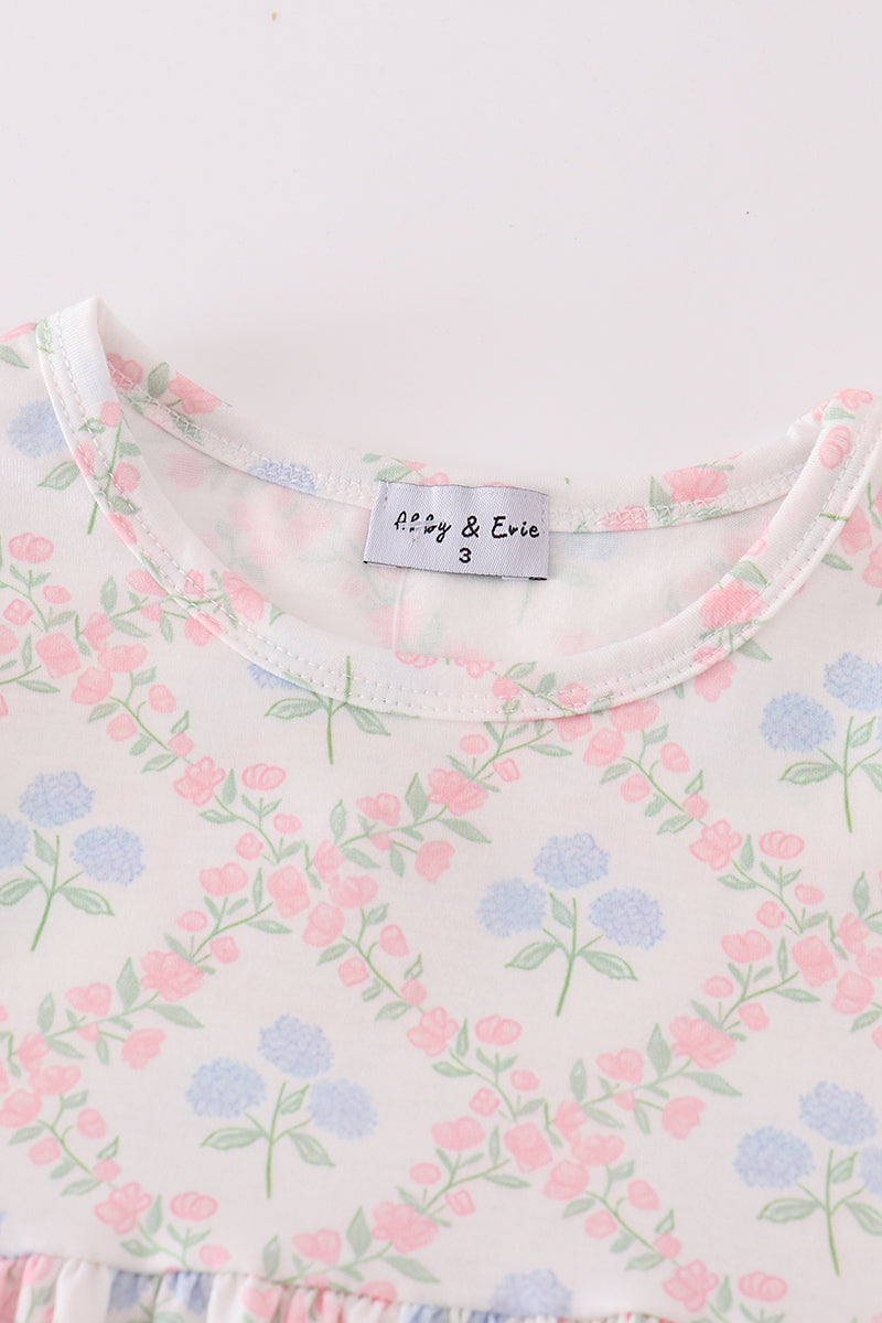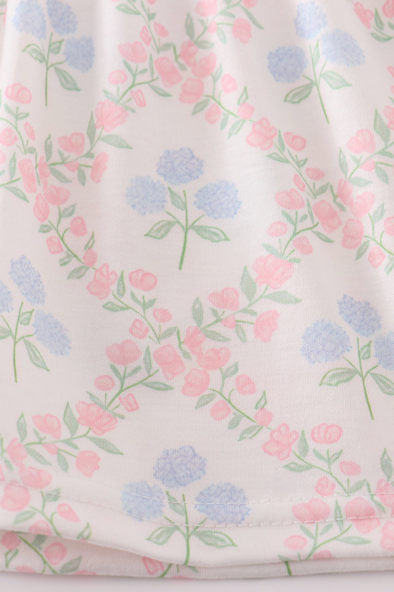 Get your little fashionista ready for summer with this blue hydrangea print girl set. Featuring a playful floral design, this set is perfect for any fun occasion. Let her embrace her unique style with this quirky and cute outfit. (Warning: may cause excessive twirling and cute overload!)