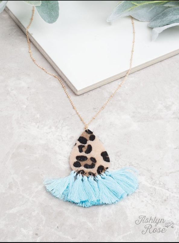 Full Leopard Teardrop Necklace with Fringe Tassels, Sky Blue