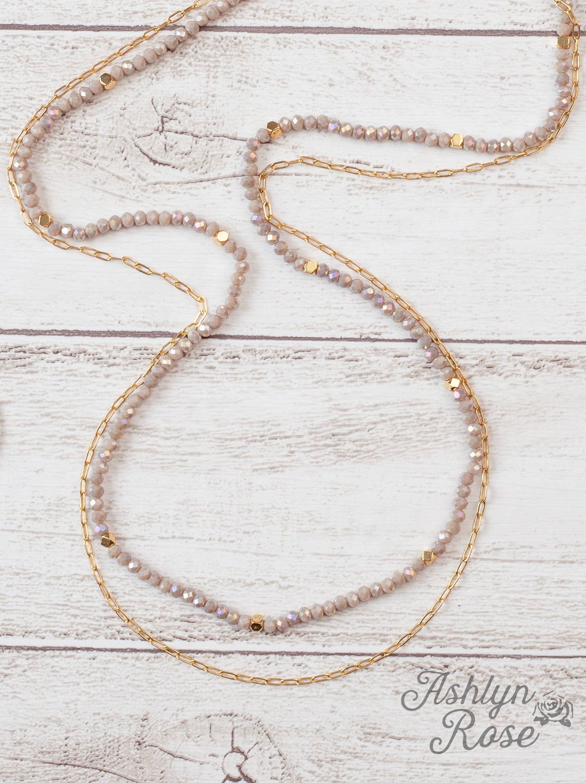 Glitz, Glam, Simple Strands Double Beaded Grey Necklace with A Gold Chain