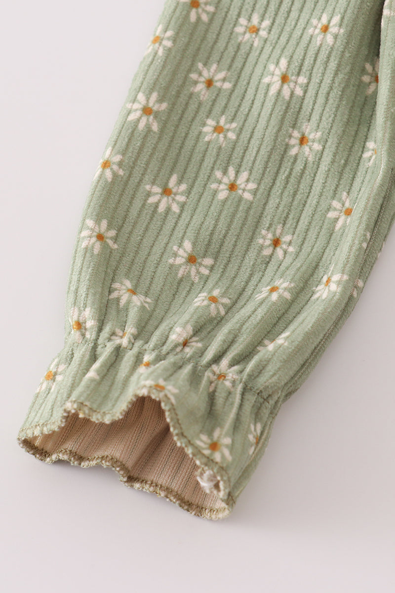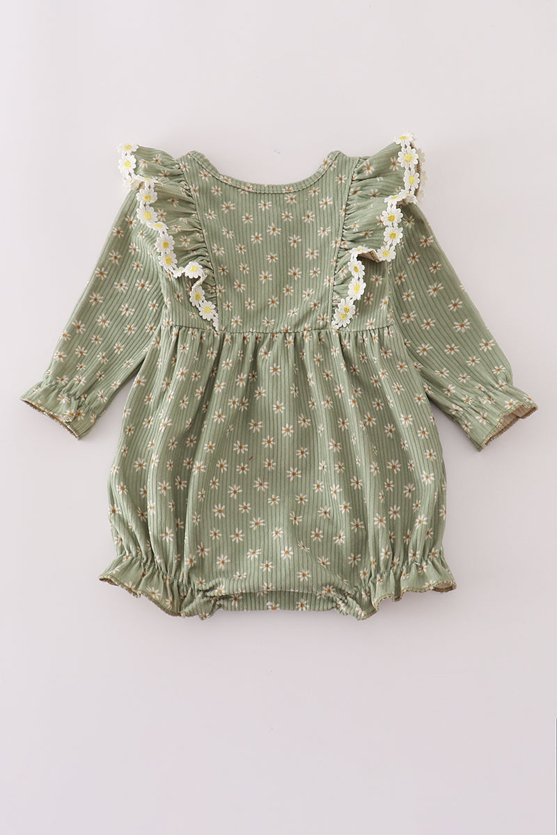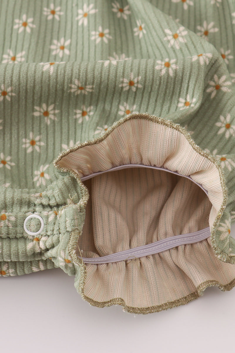 This charming green corduroy bubble romper combines playful floral lace and delicate ruffles for a sweet, whimsical look. Soft and cozy, it’s perfect for little ones to explore and play in style. The unique bubble silhouette adds a fun twist to classic textures, making it a delightful addition to any wardrobe.