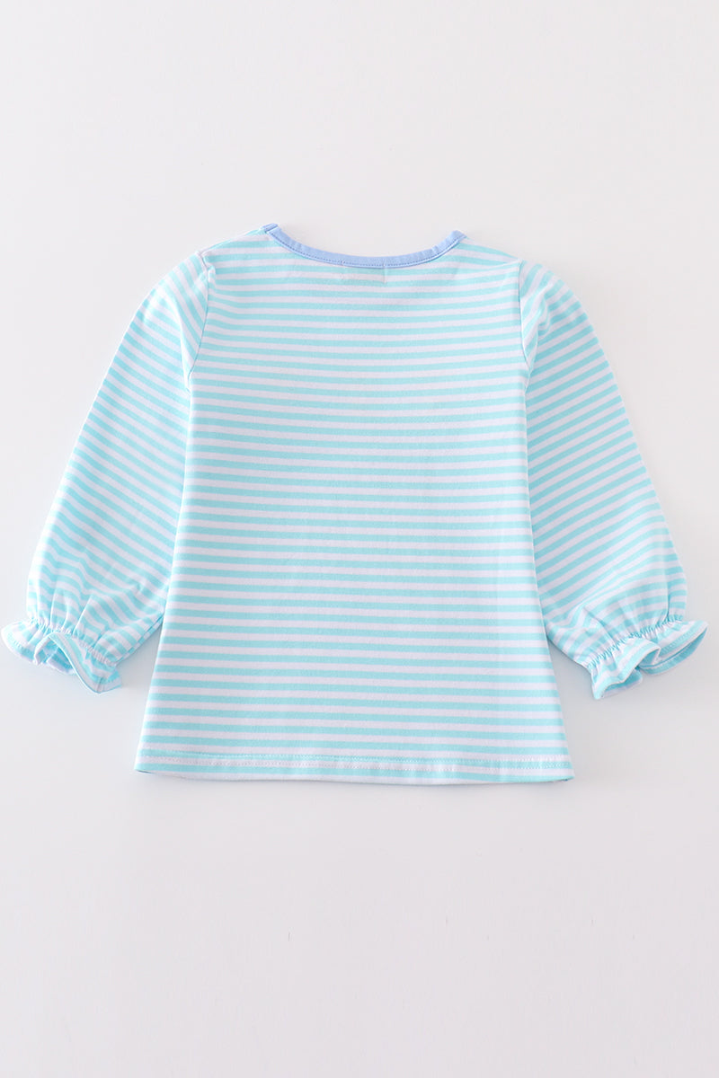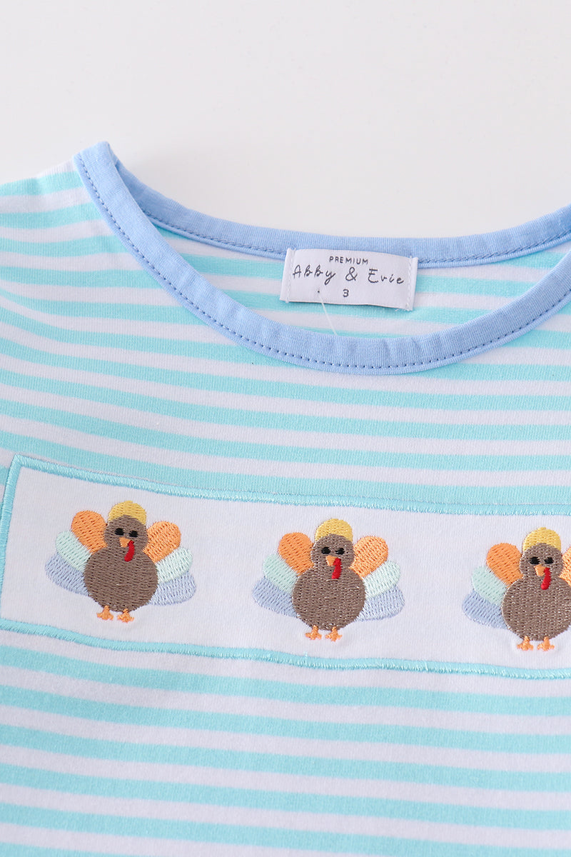Gobble up the compliments with our playful green stripe turkey embroidery girl top! This quirky and fun design is sure to make your little one stand out. Made with soft fabric for all-day comfort and featuring unique embroidery, this top is a must-have for any fashionable kid.