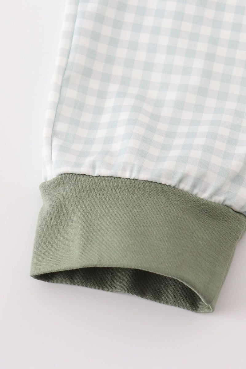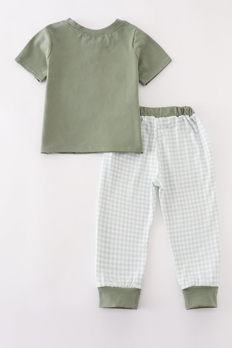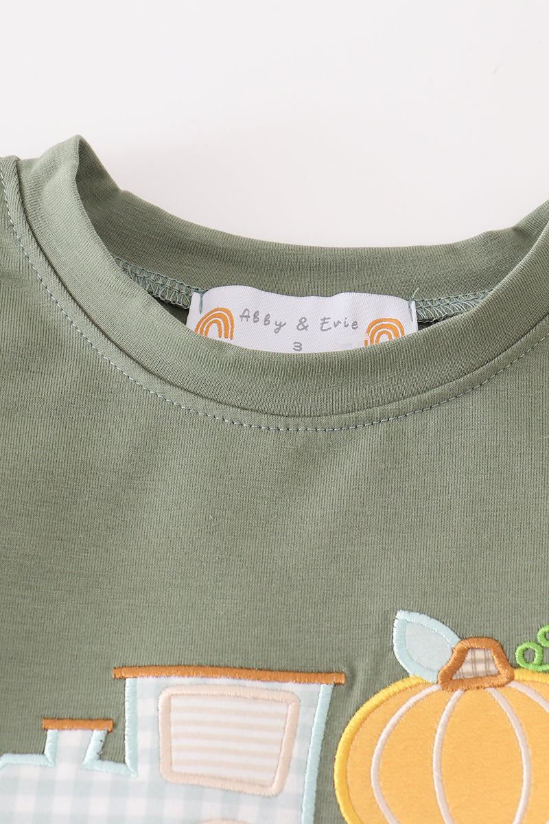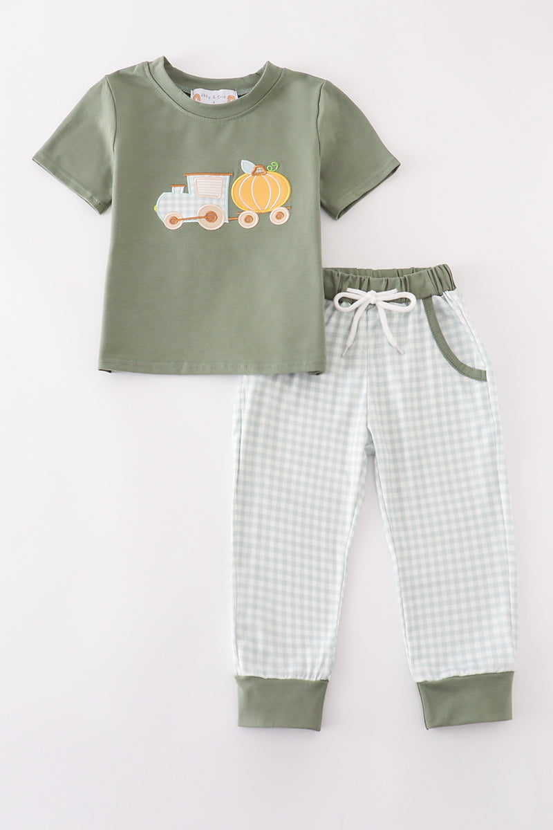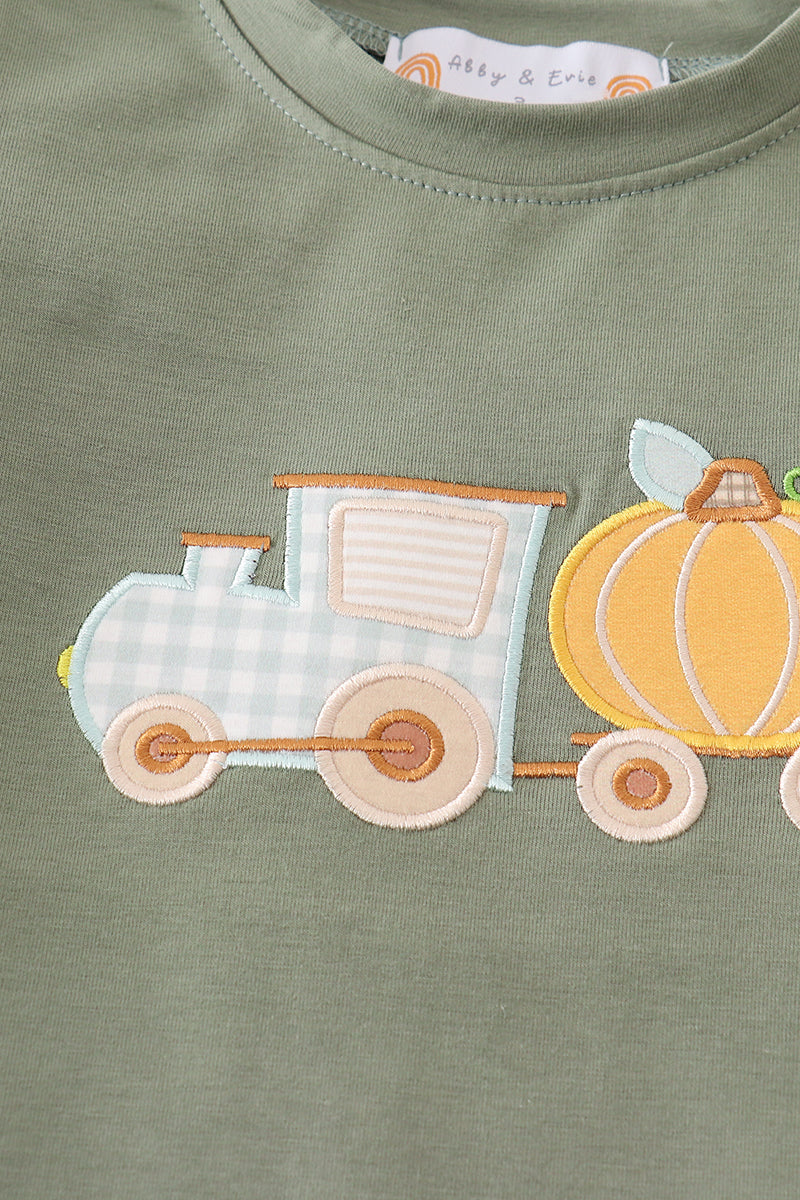 Get ready to go on an adventure with this Green train pumpkin applique boy set! Featuring a playful train design and a festive pumpkin applique, this set is perfect for any little boy looking to make a statement. Comfortable and stylish, it's the perfect outfit for any occasion!