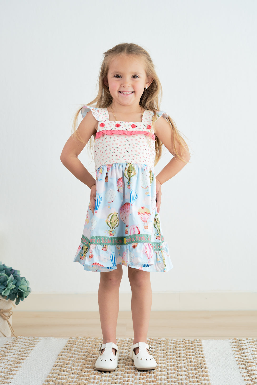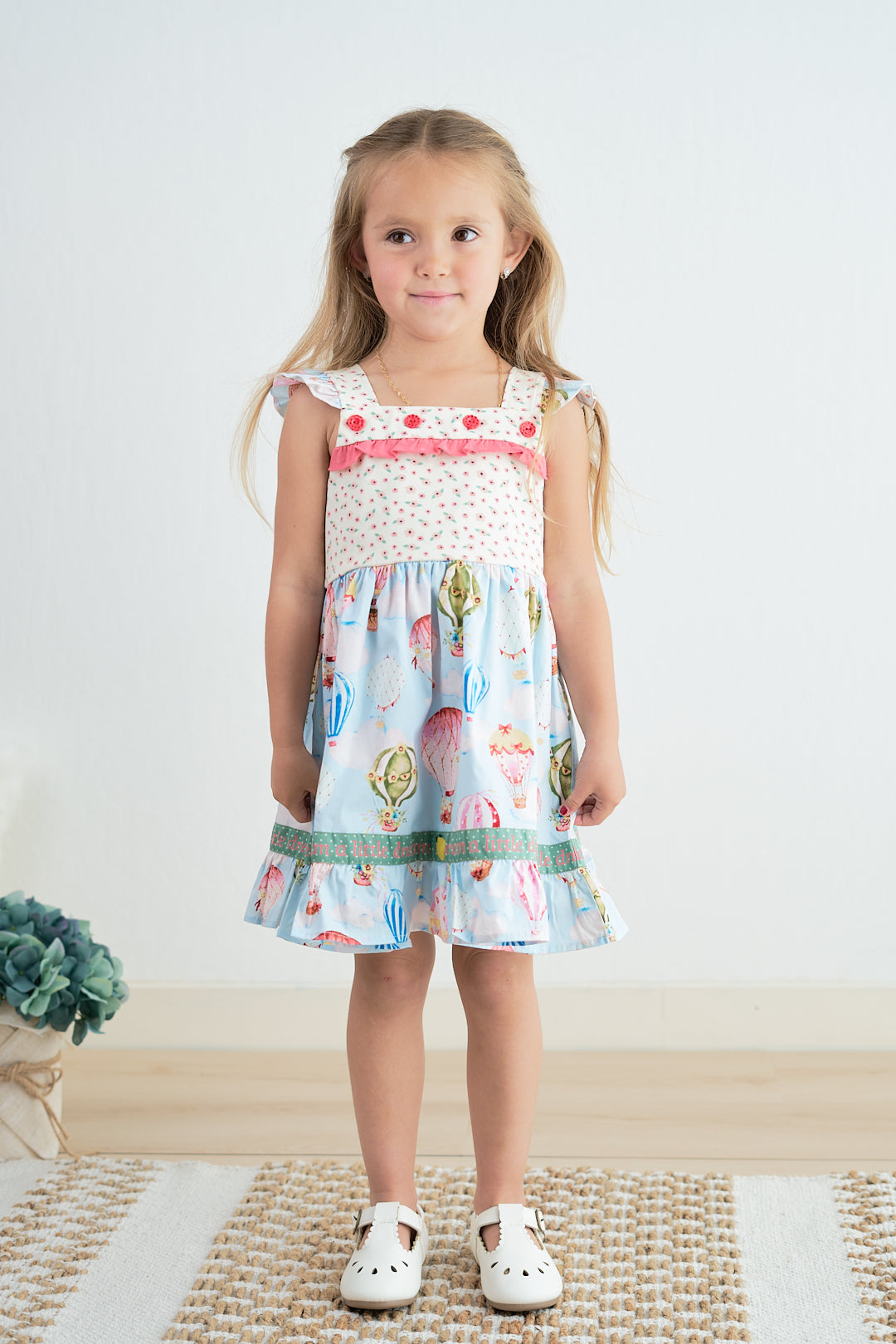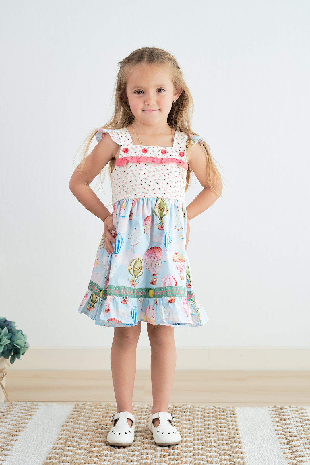 Get ready to turn heads in our Platinum balloon print floral flutter trim dress! This stylish and unique dress features a playful balloon print and delicate flutter trim, making it perfect for any occasion. With its eye-catching design, you'll be sure to stand out from the crowd and make a statement.