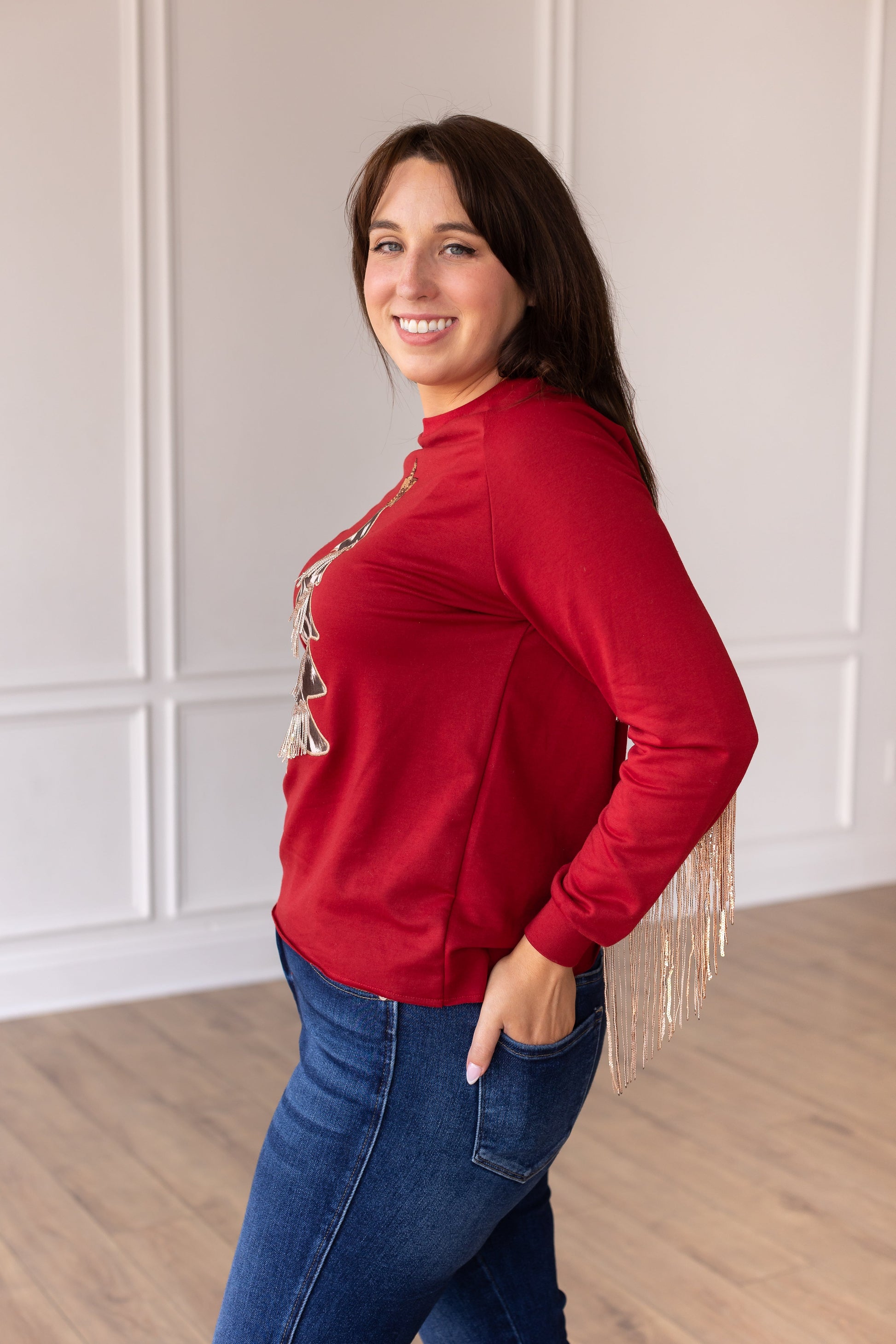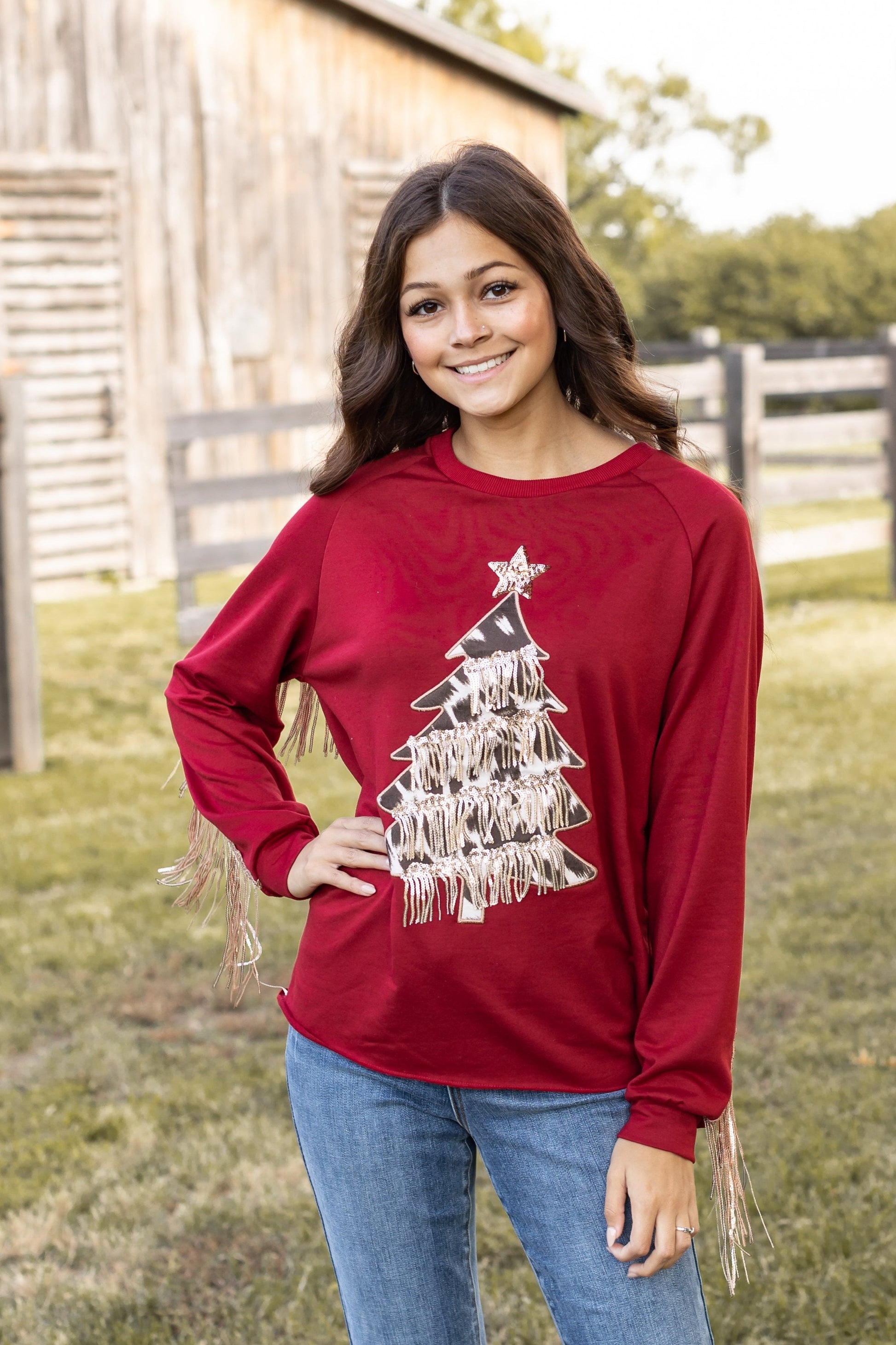 The unique cowhide tree design and sequin fringe detail add a touch of Western flair and holiday cheer to the vibrant red top. Whether you're attending a holiday party, festive gathering, or simply want to make a bold fashion statement, this top effortlessly enhances your look with a blend of elegance and playful sparkle.