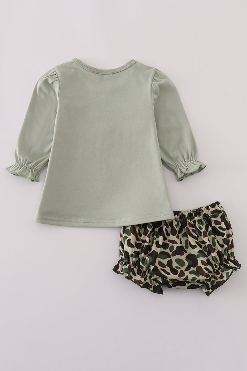 Dress your little one in festive fun with this Sage Camouflage Turkey Applique Bloomer Set. Featuring a charming turkey applique on a soft sage camouflage background, this set combines comfort and cuteness perfectly. Ideal for playful days and holiday gatherings, it adds a touch of whimsy to any outfit while keeping your child cozy and stylish.
