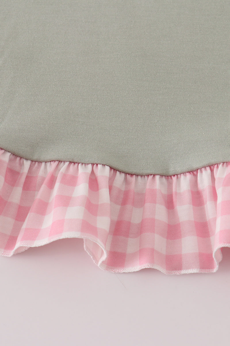 Celebrate the season in style with this playful sage dress featuring a charming pumpkin and turkey applique. The delicate ruffles add a fun, flirty touch, making it perfect for festive gatherings or cozy fall days. Soft and comfortable, it’s designed to keep little ones twirling with joy all day long.