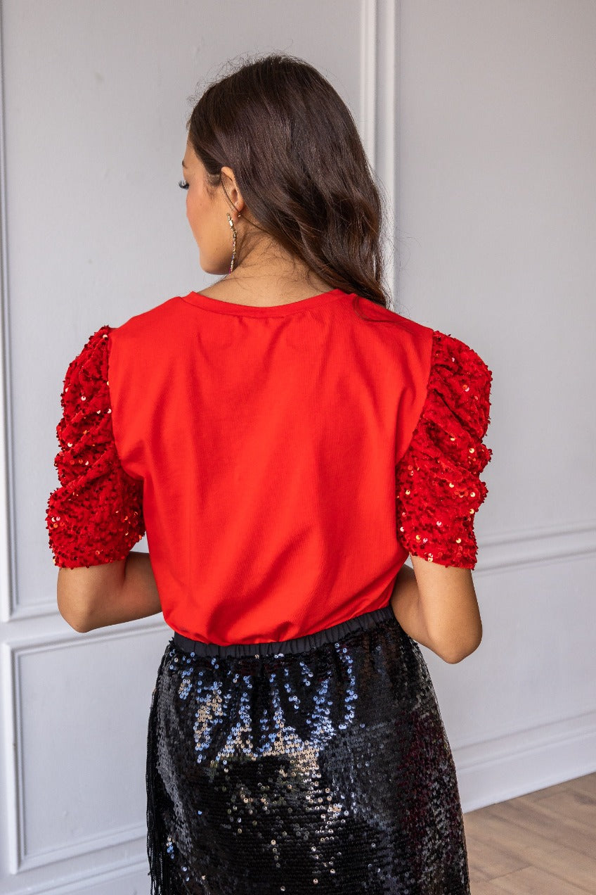 Pair it with your favorite pants, skirt, or jeans to create a chic and polished ensemble that exudes confidence and style. The Red Puff Sequin Sleeve Top effortlessly transitions from day to night, allowing you to showcase your unique fashion sense with grace and poise.