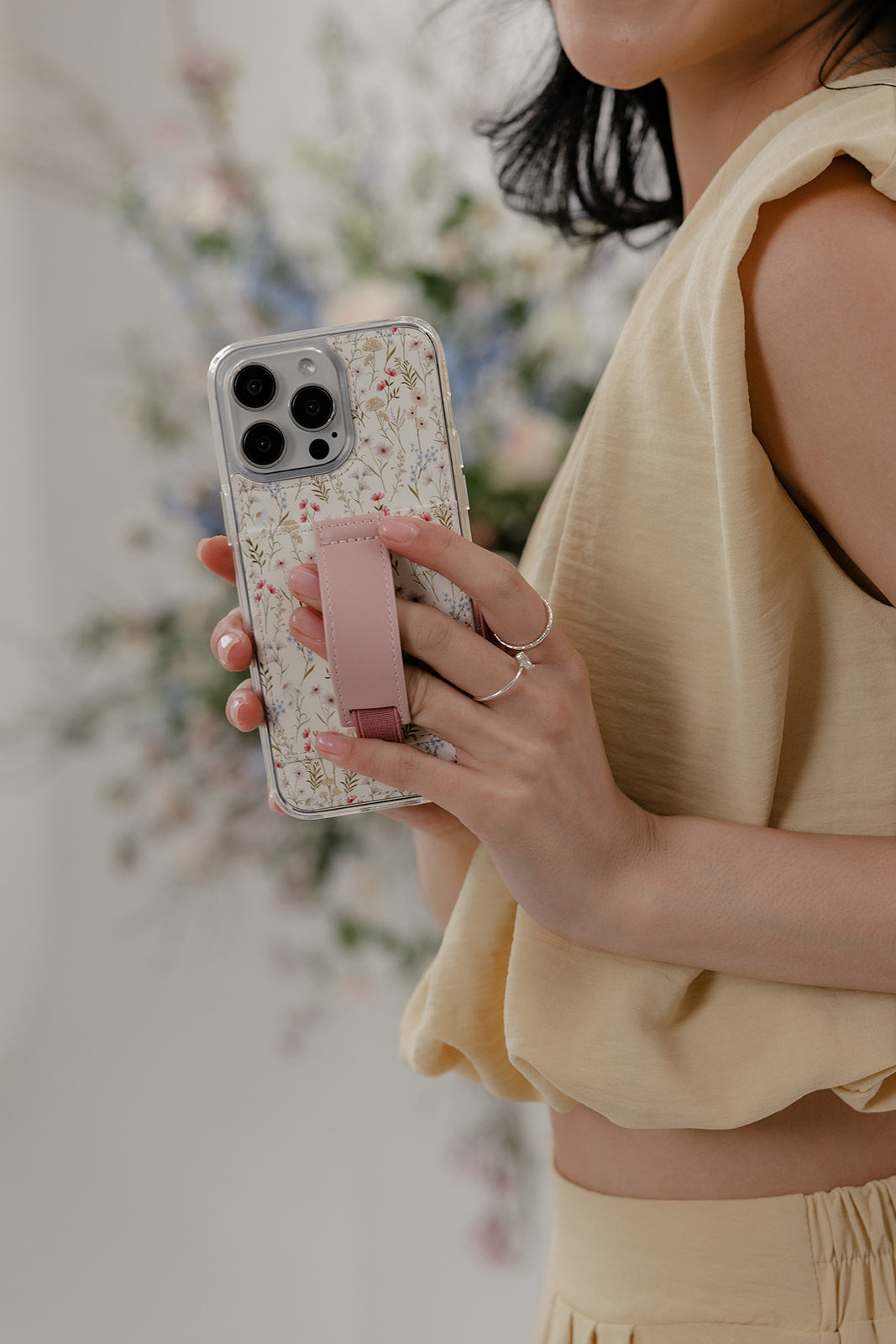 Case Design: Blue, white, pink, peach and mauve flowers with a solid mauve strap.